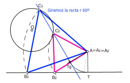 En la primera de ellas giraremos la circunferencia 60º, y en la segunda, que os dejo enlazada en la imagen, giraremos la recta el mismo ángulo. El centro de giro será el punto A, que es a su vez uno de los vértices del triángulo equilátero que me piden (hay dos posibles soluciones).